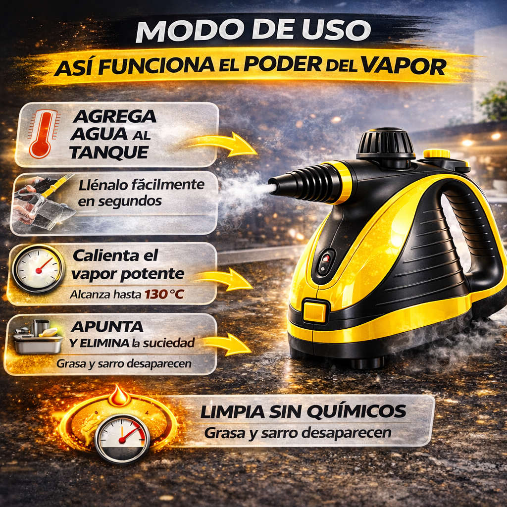 Olvídate de pasar horas frotando grasa, sarro y suciedad difícil con paños o esponjas que casi no dan resultados. Con VapoElite™ descubres una forma mucho más eficiente de limpiar tu hogar, un potente sistema de vapor a alta temperatura que afloja la suciedad incrustada en segundos, permitiéndote limpiar cocinas, baños, ventanas y múltiples superficies sin necesidad de usar químicos agresivos.